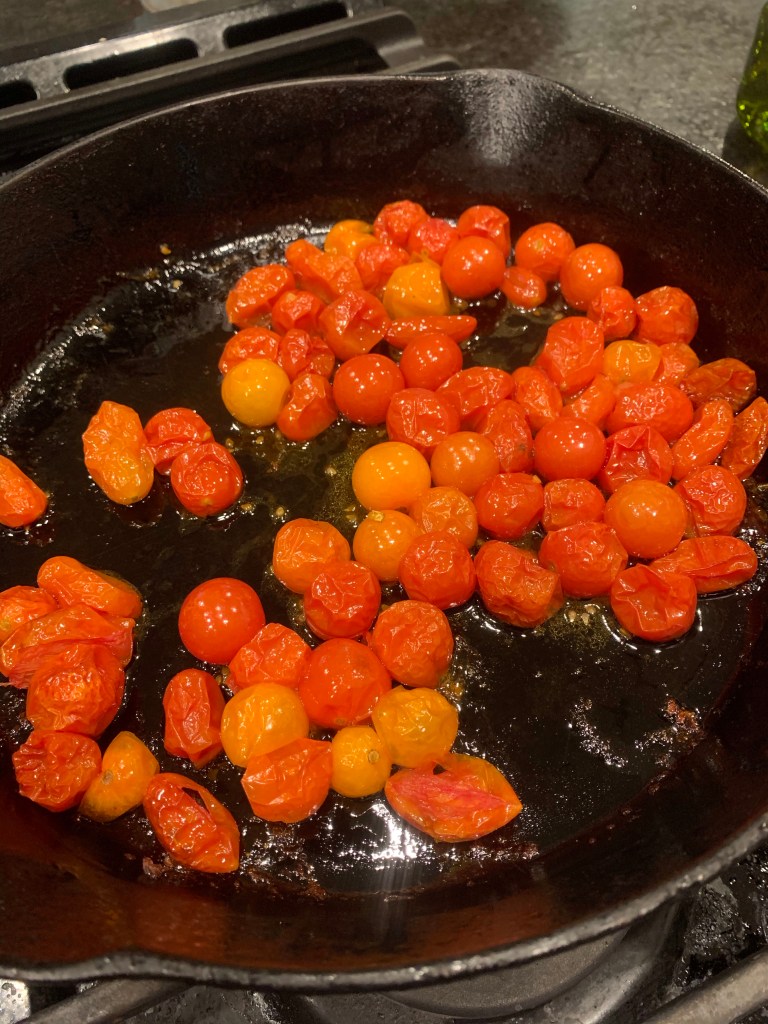 Two to three cups of small tomatoes will fit nicely into the bottom of a 10” iron skillet, and this is enough for a side dish for two or three people.