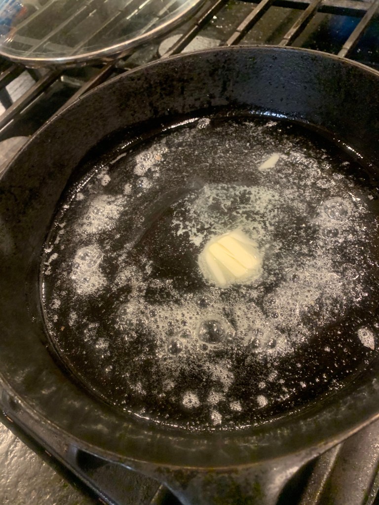 Heat your black skillet (large enough to accommodate your salmon) or your iron griddle on medium high heat with 1 tablespoon of olive oil and 1 tablespoon butter (if desired—it aids in browning the salmon and gives it additional flavor). The pan is ready when the butter is bubbling but not browned.