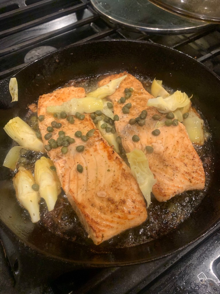 We like salmon to be medium pink in the center. You may like it more or less done. Very unscientifically, I cut into the fish to make sure it is as done as I want it and pull it the moment it reaches medium pink in the middle. You can leave it a bit longer if desired, but salmon dries if overcooked. It also continues to cook a little when removed from the heat. Plate the salmon, then scoop up the capers, artichokes and crispy bits from the pan and serve them on top of the salmon.