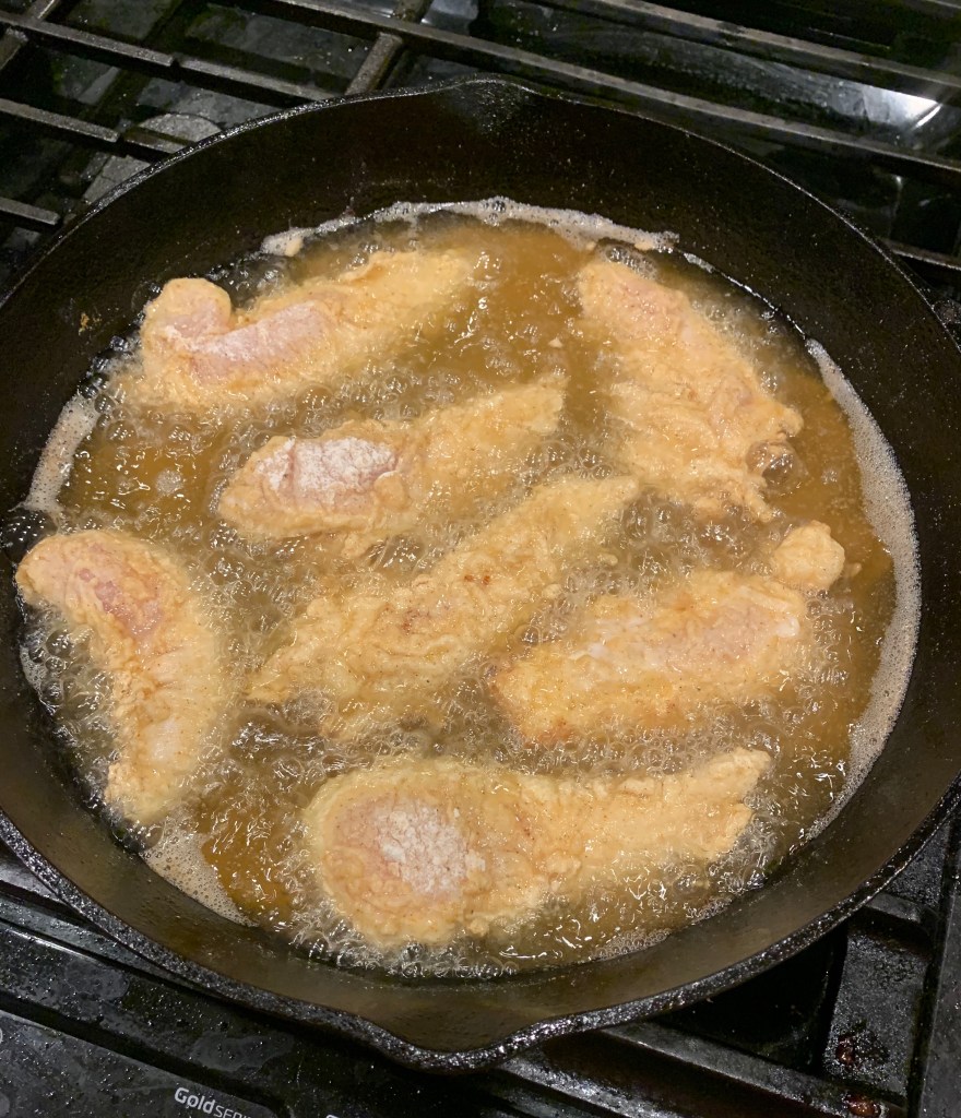 Use a Dutch oven or an iron skillet to fry chicken, and the cooking oil should fill the pan to point where your chicken is about 2/3rds covered with the oil. We were cooking 24 tenderloins when writing this post, so we used the 12” skillet and about one inch oil. It cooked pretty quickly, and eight tenderloins fit in the pan at a time.