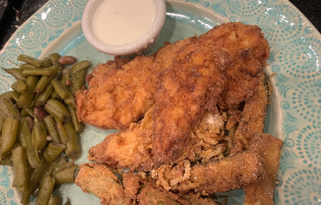 Once oil is hot (test by dropping a bit of flour into the oil) move each piece of chicken from the marinade into the flour mixture. Turn it over to coat evenly and place it in the cooking oil. Don’t crowd the pan, or it will slow down cooking and cause the coating to absorb more oil. Cook until browned on one side, then flip. Once the other side is browned, insert meat thermometer to insure that tenderloin reaches 165 degrees in the center. Don’t forget that you may have to reduce heat slightly for bone-in chicken. Remove cooked chicken from skillet and drain on a paper towel.