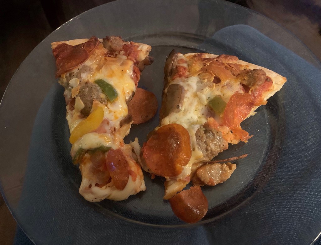 We had frozen pizza because I forgot what day it was. I thought we were grilling with the neighbors, but I also thought it was Wednesday. Somehow, Monday was 2 days long. We also are suffering from a water well issue this week, and I’ve been looking for ways to use a fewer cooking utensils and dishes that have to be washed. Frozen pizza was on hand for just such an occasion and for my calendar confusion. Haha.