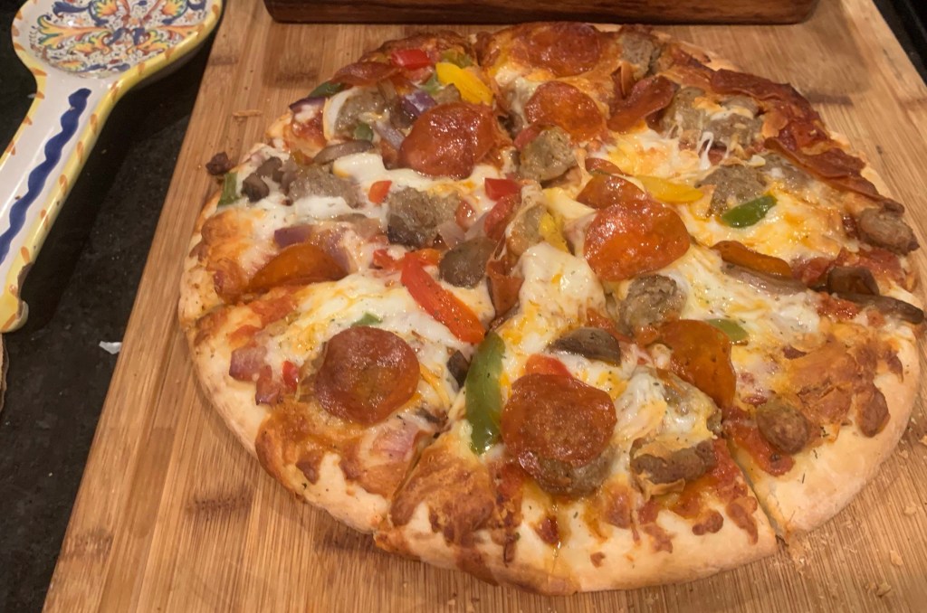 Frozen pizza can be great. Doctor it up a bit if you want and make it your own. The problem I find with frozen pizza is that it wants to be cooked on the bare oven rack, and the bottom gets too brown and crunchy before the top gets cooked properly. The black skillet corrects that issue.