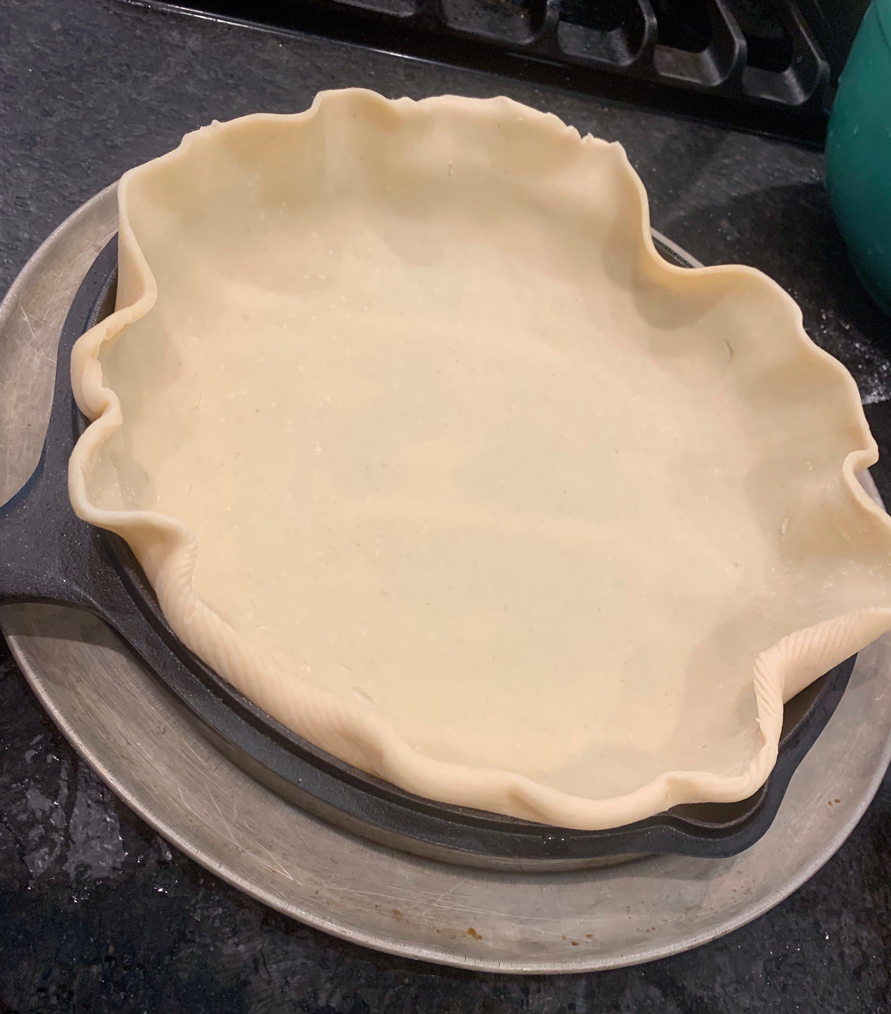 This galette could easily be created in a skillet or on any iron pan. My inverted dutch oven lid was the perfect size and shape for an already made rolled pie crust, and it looked super cool. Plus, I found that it was much easier to slide the finished galette onto a serving plate than trying to lift it from a deep sided pan.