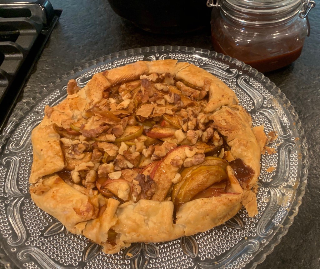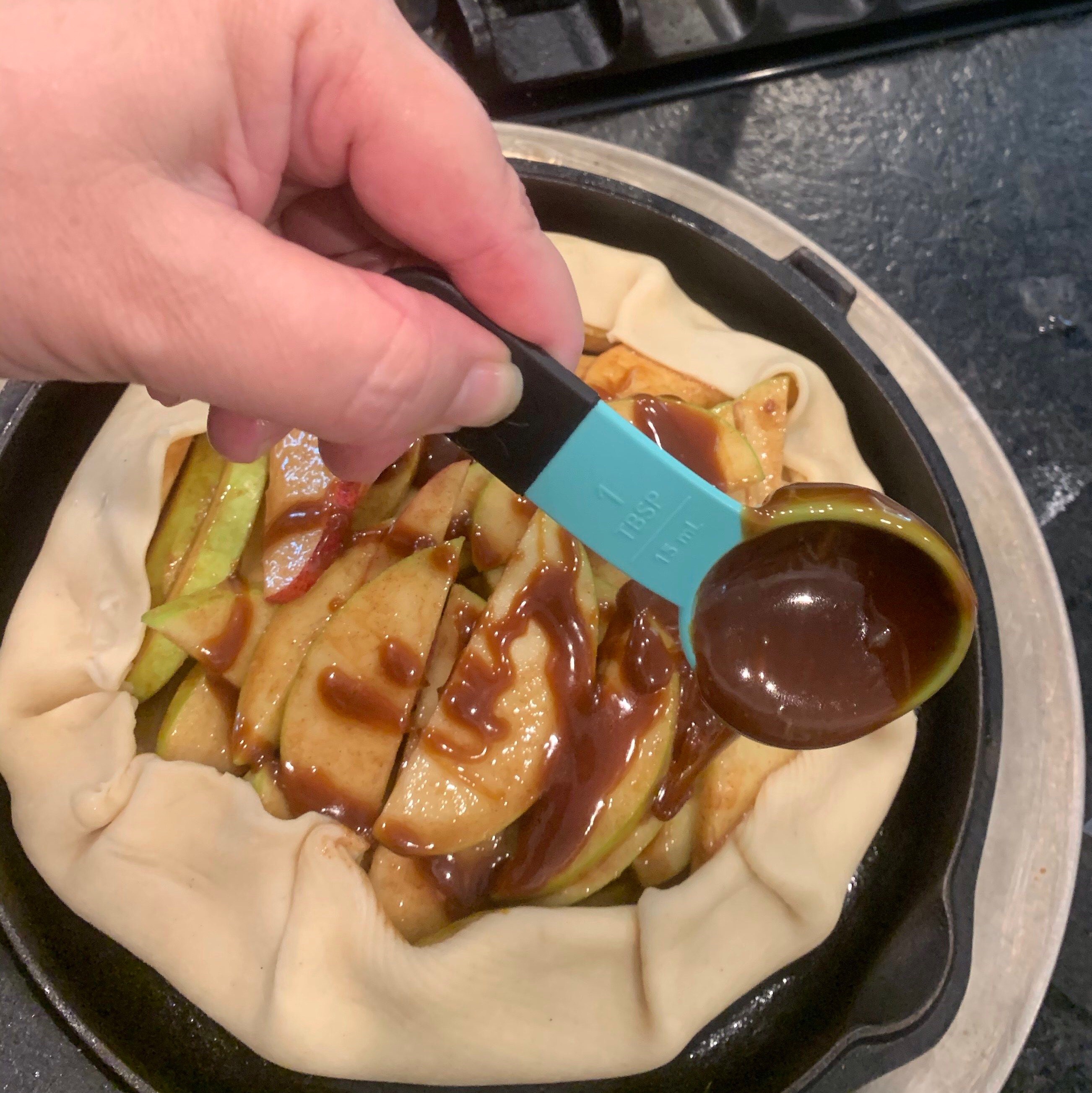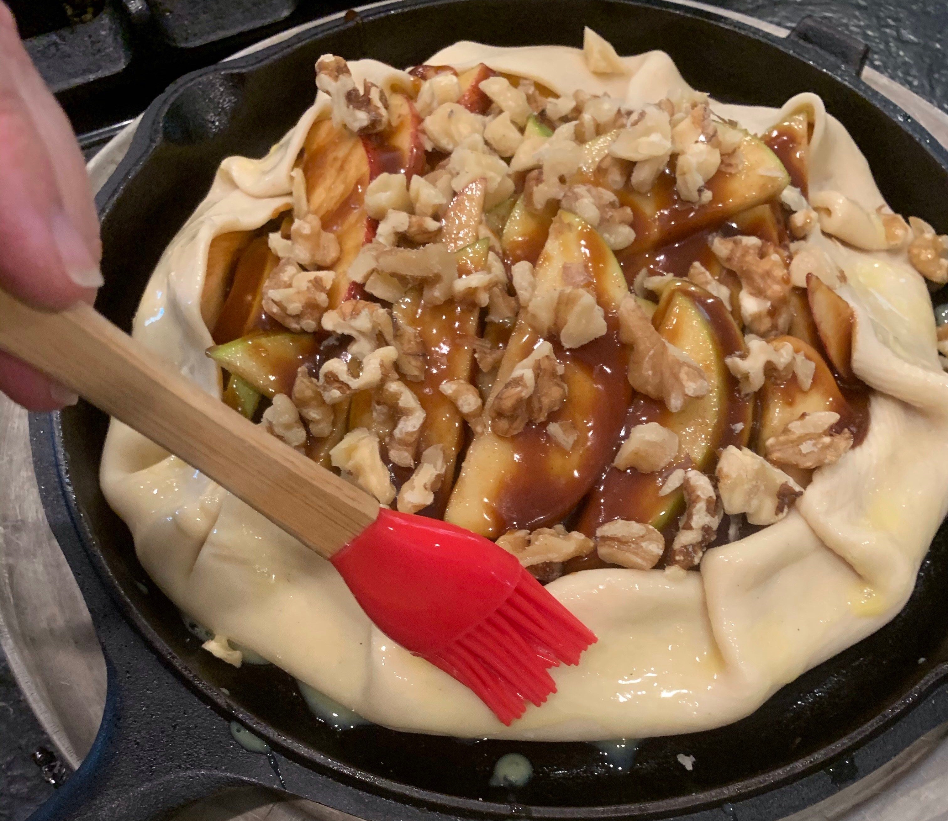 Drizzle 1/4 cup of caramel sauce* over the apples. Brush the crust with egg mixture. Sprinkle nuts, if desired, over top of the Galette.