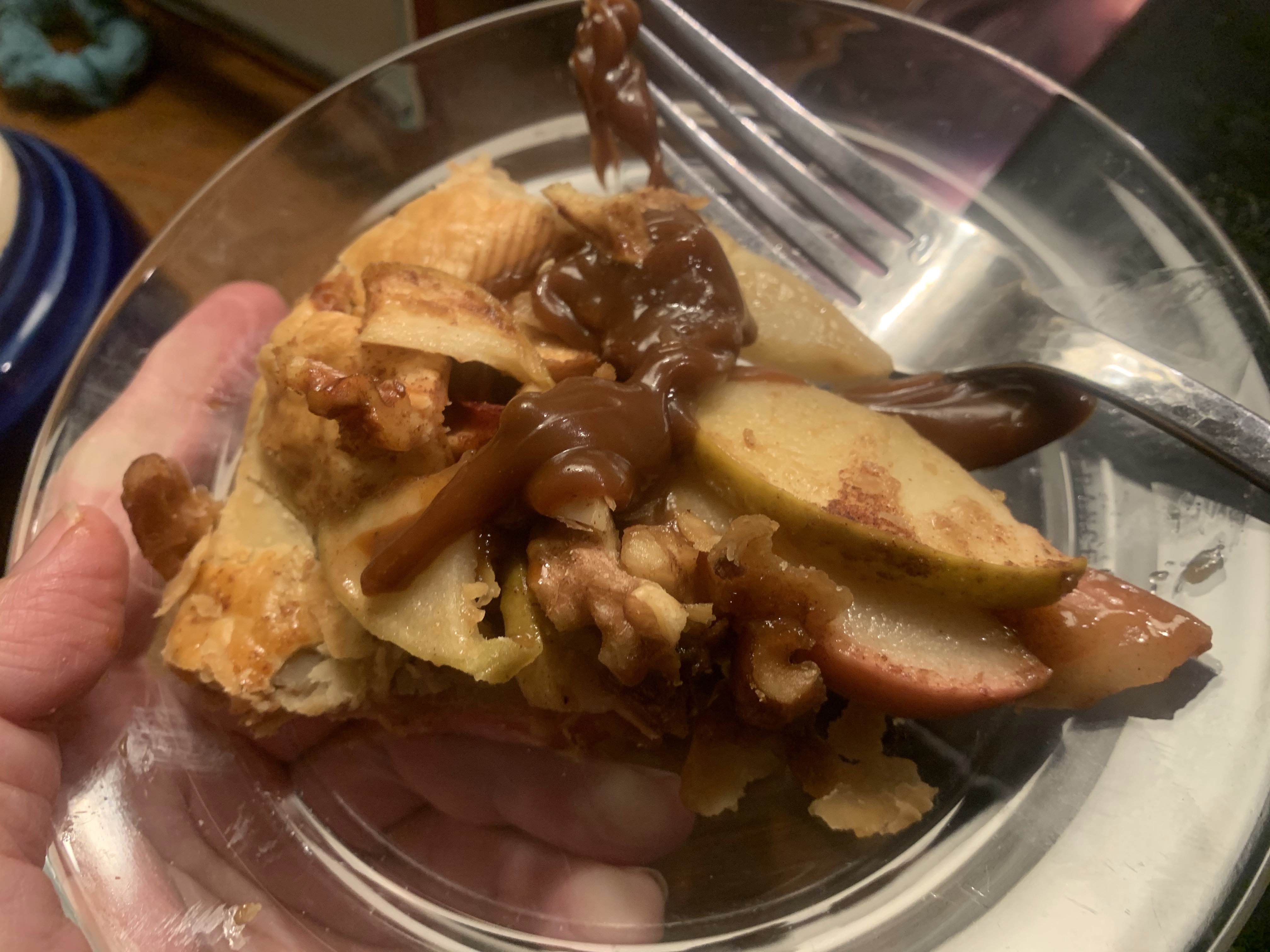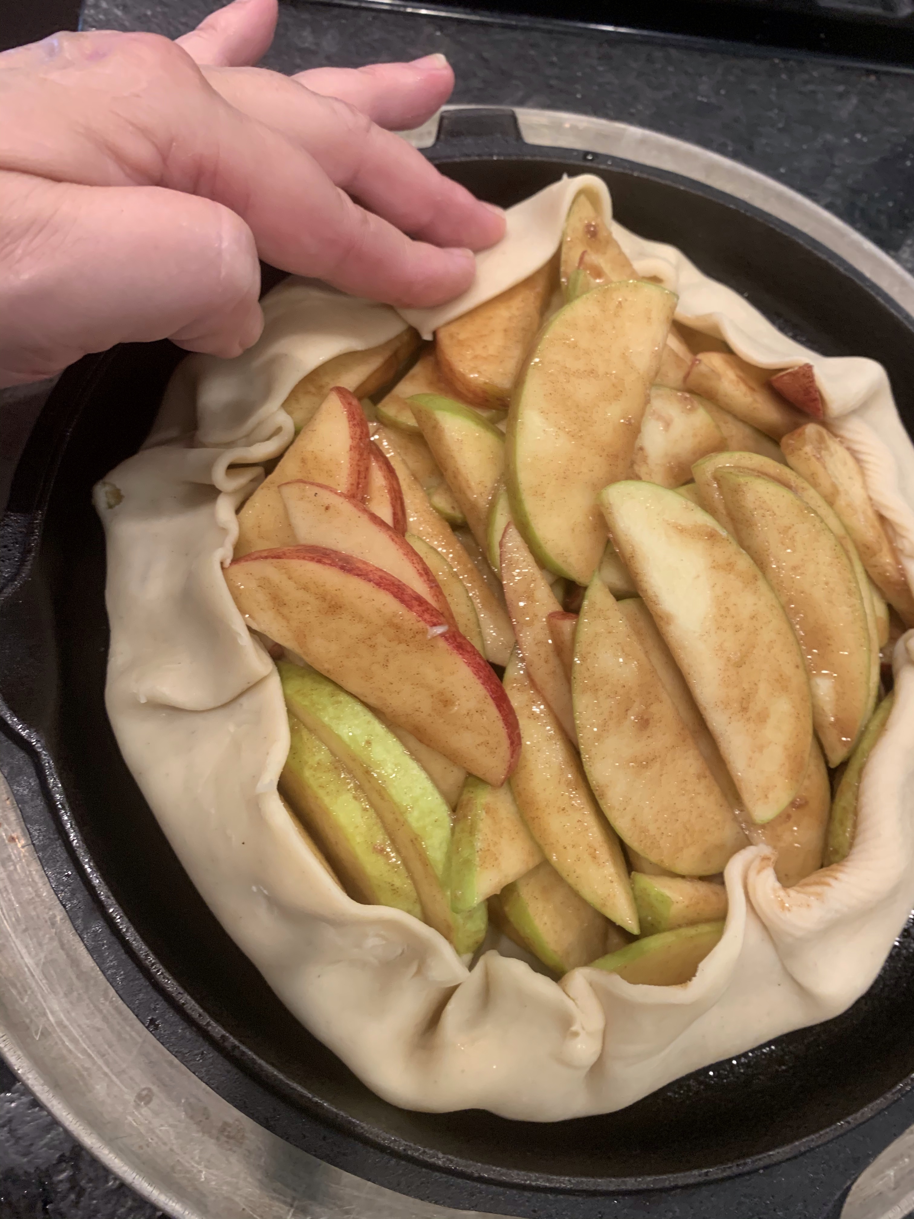Often my quick galettes are glazed with some jelly. My pantry is full of various jellies and preserves that I “binge” canned this summer. However, the recipe to which I was drawn to didn’t incorporate any of my jelly. Frankly, it is more fall-ish. And, being the Iron Maiden, I opted to craft this pastry on—you guessed it—an iron surface.