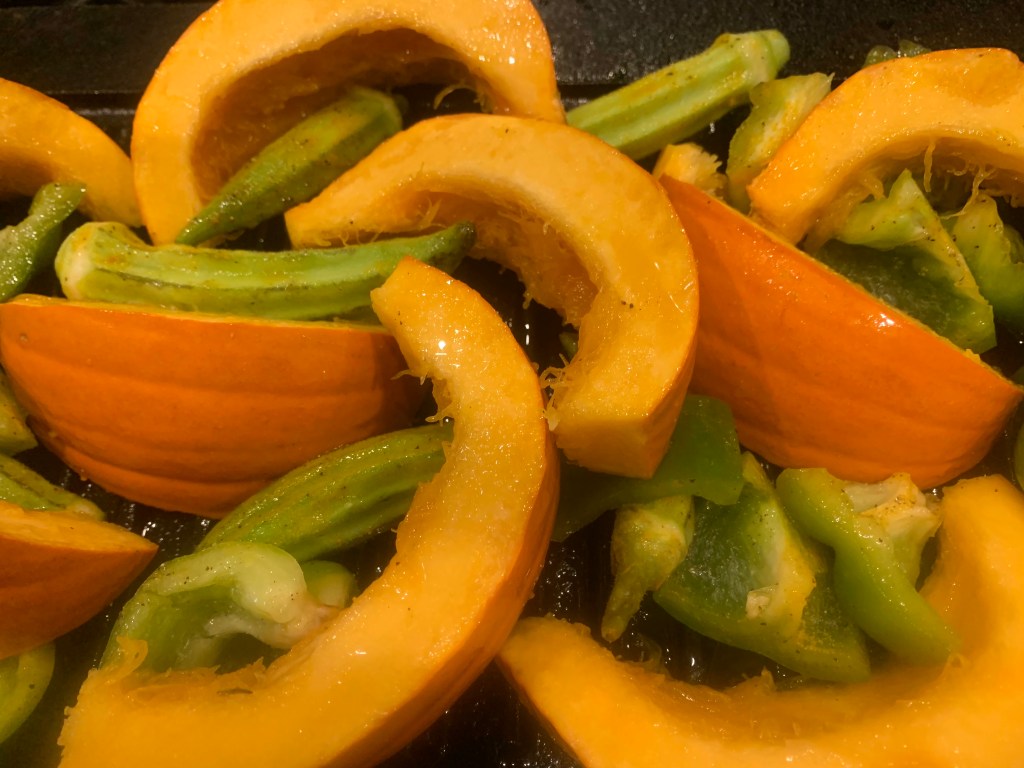 Place the pumpkin and other veggies on a ribbed griddle pan and bake in a 350 degree oven. Flip everything over after about 15 minutes. Cook 15 more minutes or until done. A good char brings out a sugary component in the pumpkin and— Yum!