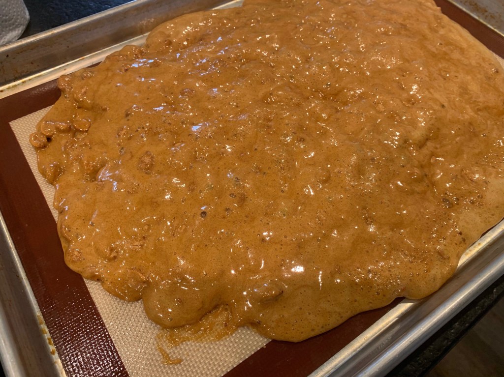 As soon as you have completely stirred the baking soda into the mixture, pour the hot mixture onto the silicone pad or greased cookie sheet!! Also quickly use your warm spoon to spread the mixture out as thin as possible. This allows for a thinner brittle and spreading it quickly allows it retain that beautiful gloss on the top.