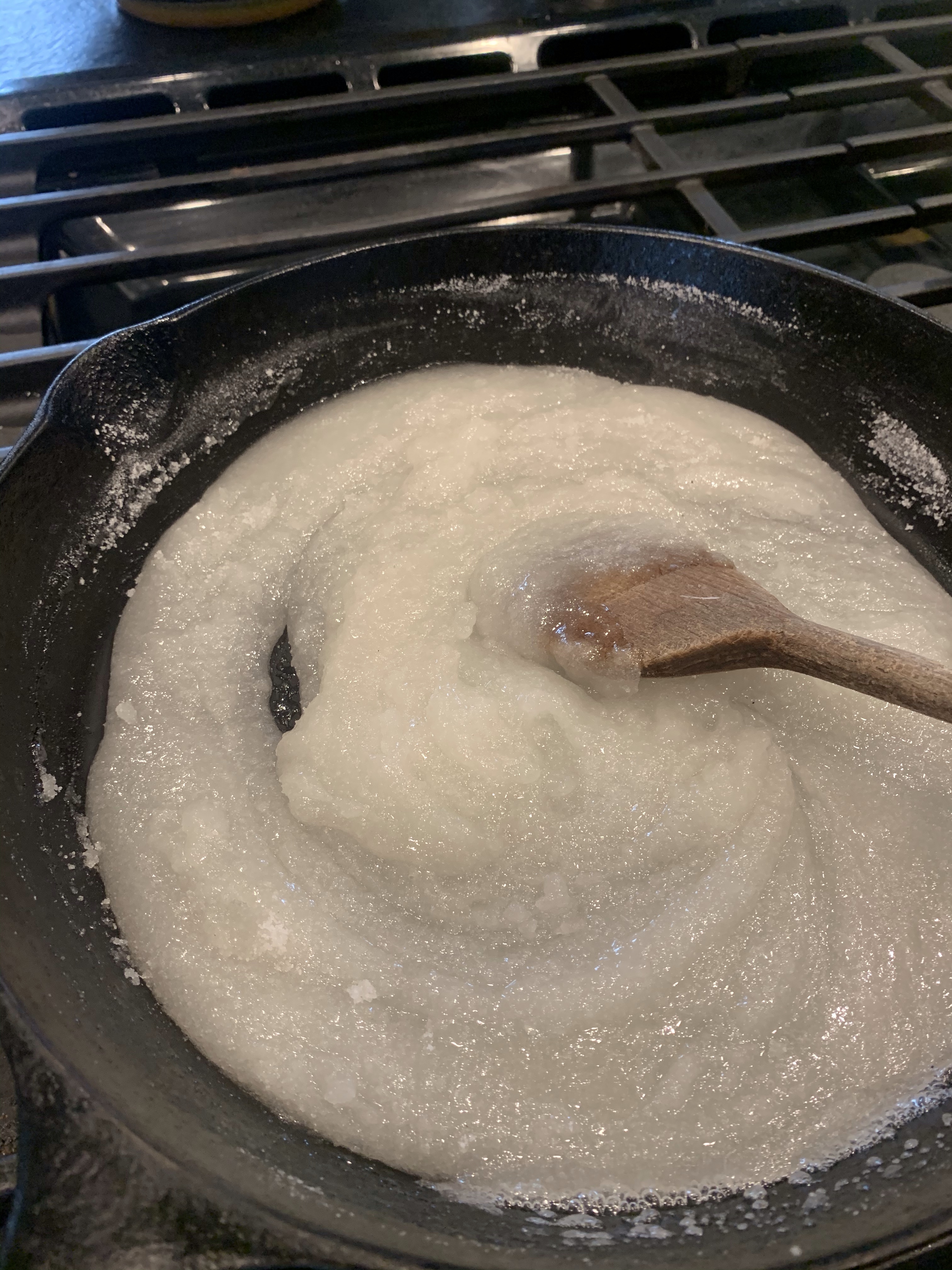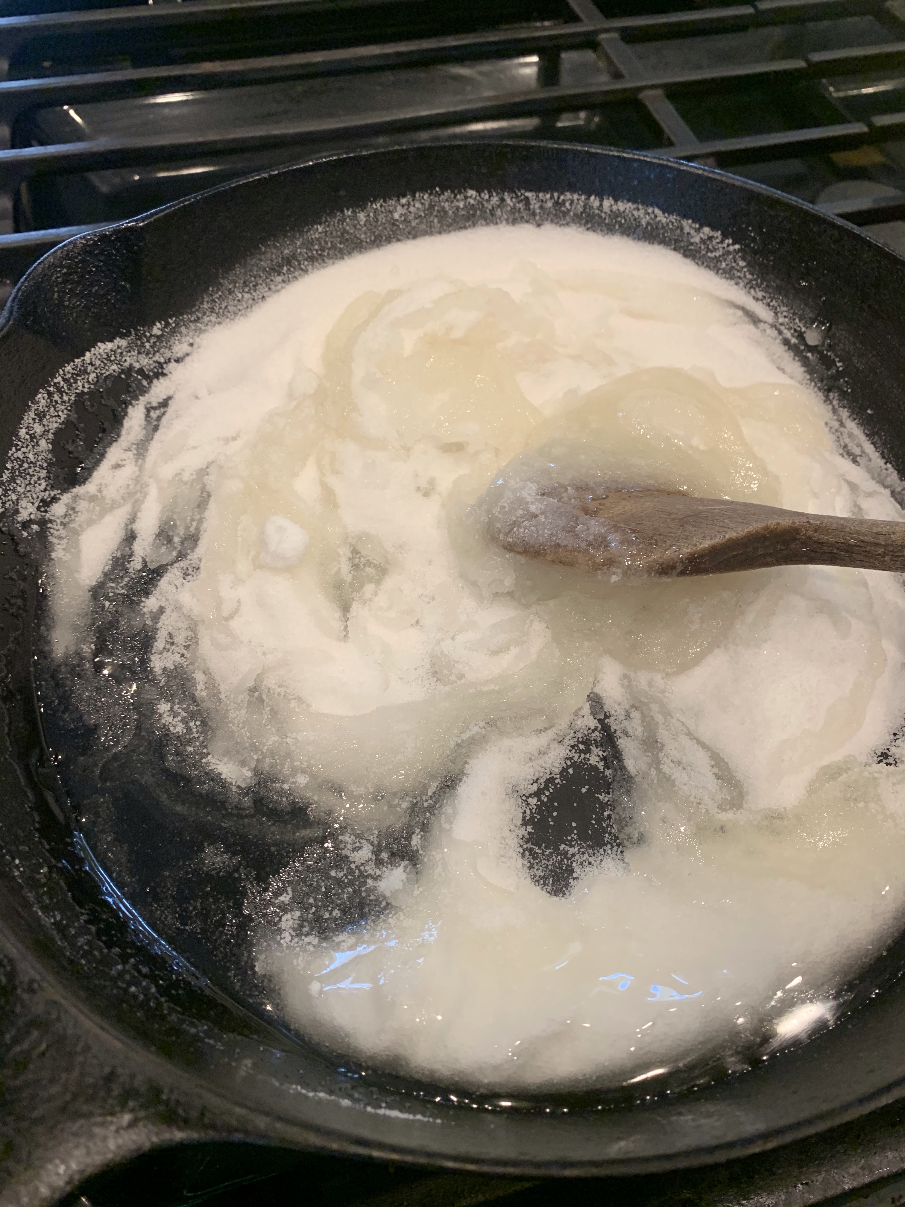 TOOLS: Of course, you need a black skillet, and I prefer to use a wooden spoon. I also recommend a sheet pan lined with a silicone sheet on which the hot candy will be poured. This is the best landing pad for the finished candy, and you want to have the pour surface ready because the molten sugar will scorch or turn into a solid peanut hockey puck if left too long in the skillet. If you don’t have a silicone sheet, you can simply grease a cookie sheet with a bit of butter.