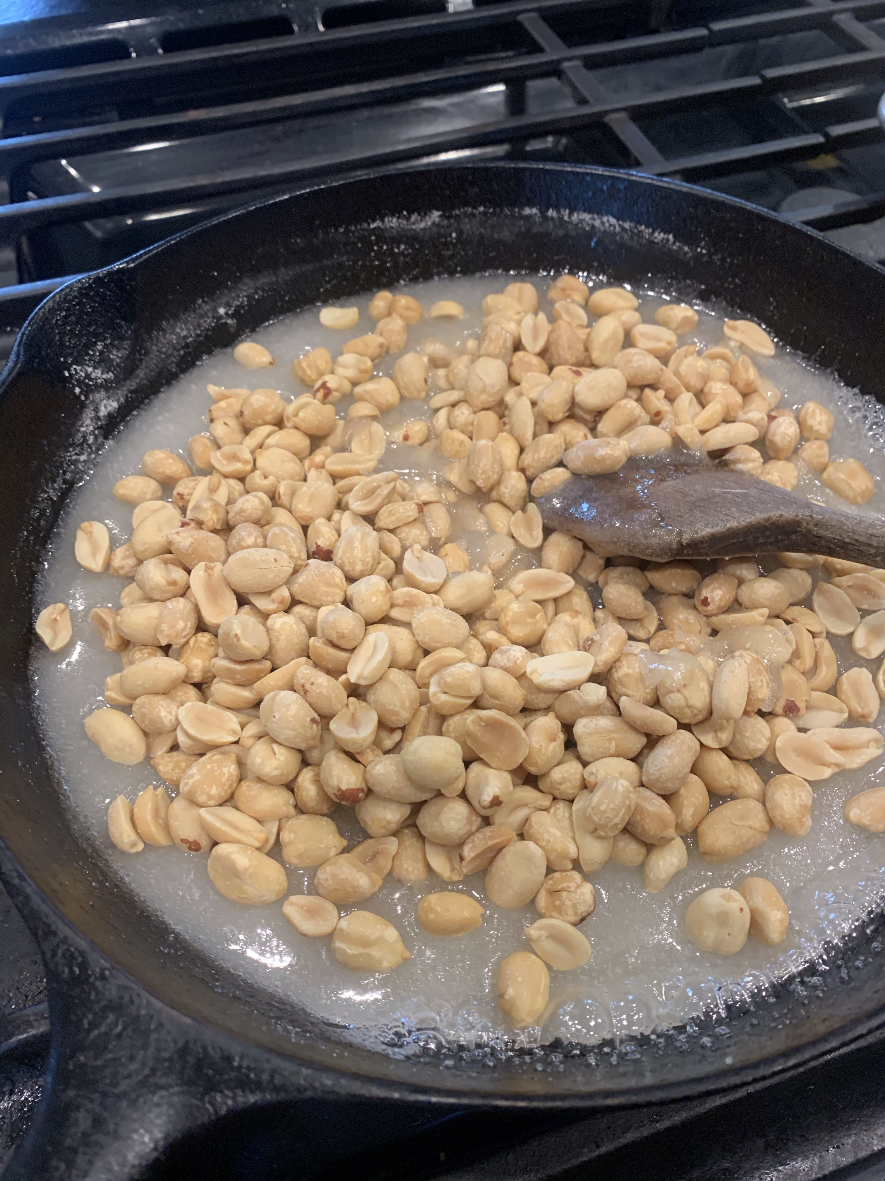 Mix your sugar and white syrup together in the skillet and continue to stir until it becomes almost transparent and liquifies. Add your peanuts and continue to stir. The mixture will be hard to stir at first, but then as they heat and the syrup continues to come up in temp, they will be easier to stir.