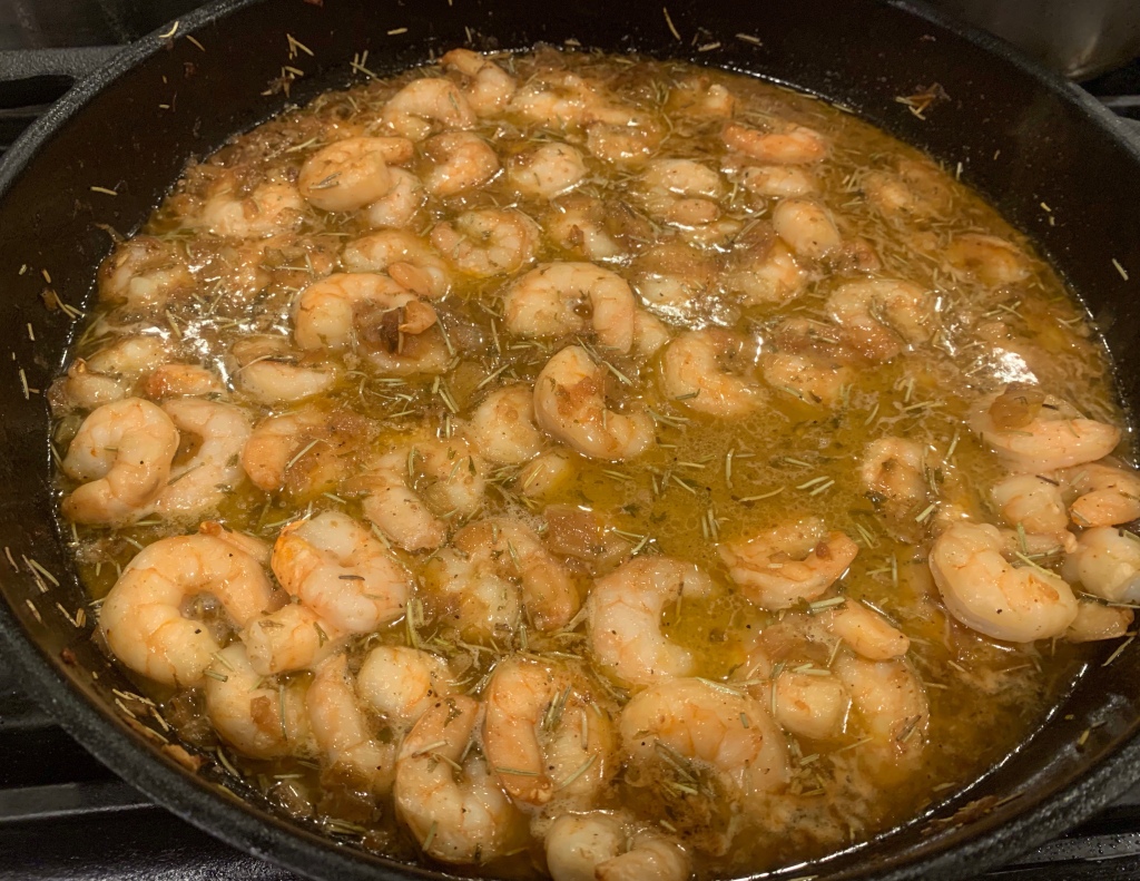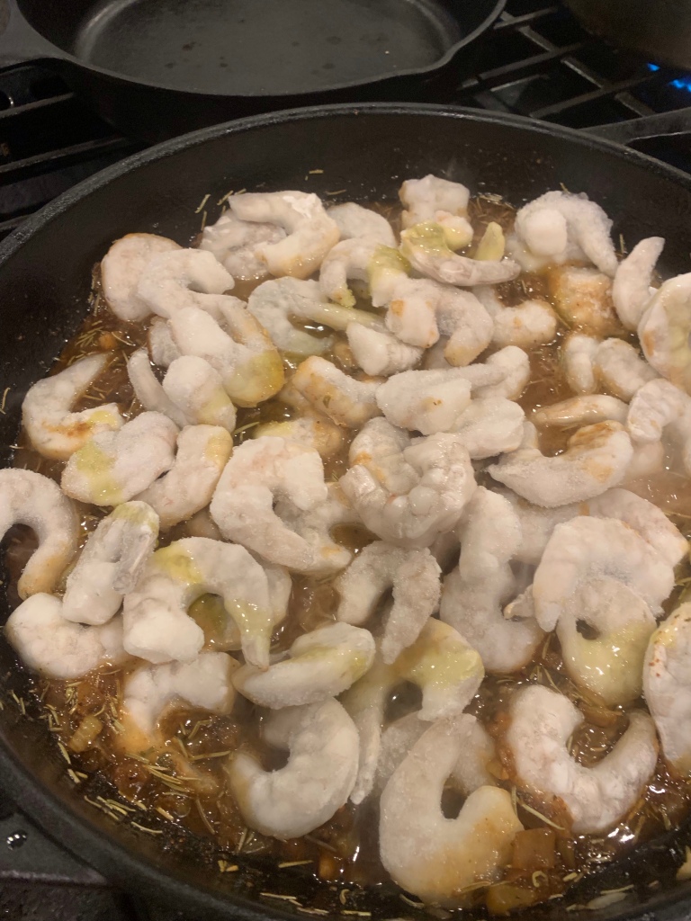 Add all of the frozen shrimp into the pan and turn off the heat. Turn the shrimp over until they are all covered in this dark savory goodness. Put the skillet/casserole in the oven to cook while you stir and finish your grits. Add a smidgen of butter to the grits also if you want to be fancy.