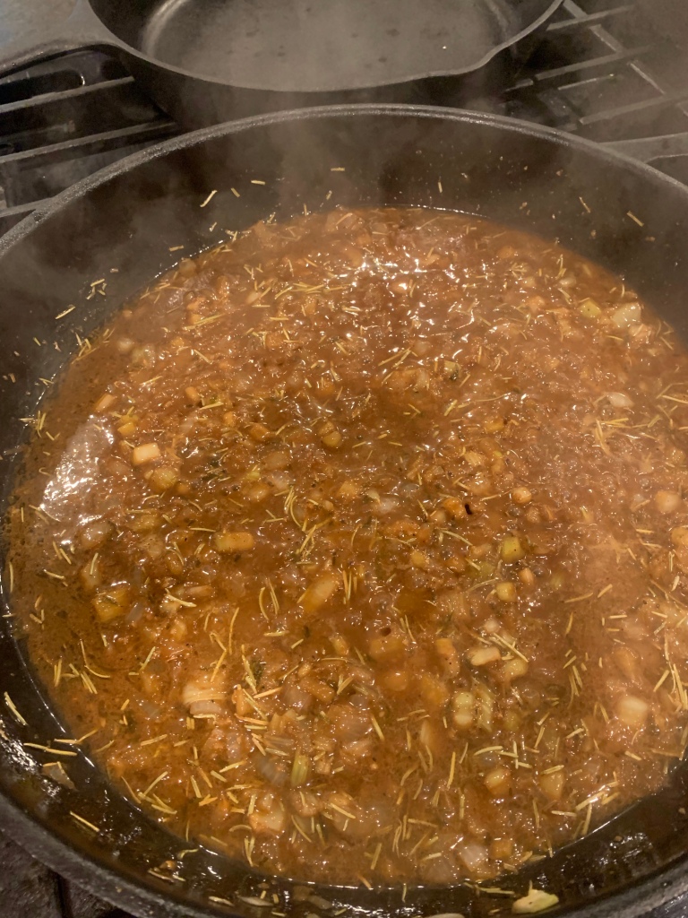 Add onion and celery and sauté until nearly transparent. Add minced garlic and stir until fragrant. Add all of the other herbs and seasonings, Worcestershire sauce, lemon juice and remaining butter, and bring the sauce to a simmer. Simmer for 5 minutes. I could drink this stuff. So delicious.