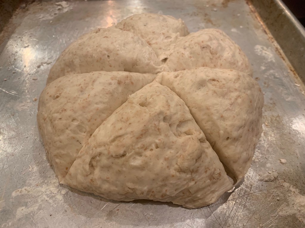 These ingredients are all mixed together to form a shaggy dough, then kneaded and folded on a floured surface for about 2-3 minutes. I used a sheet pan to prepare this dough. Wet your hands if the dough does not easily incorporate all of the flour. Once the dough comes together in a smooth ball, cover it with clear wrap for 30 minutes to let the gluten develop and make the dough more workable.