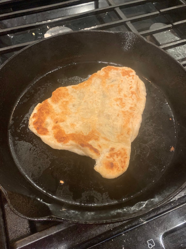 Once the skillet is hot, add a bit of olive oil and put a flattened piece of dough into the skillet and allow one side to brown. Brush the top side with a little olive oil before turning it over to brown the other side. Once the flat bread is browned, remove it and add another piece until all six pieces are cooked.